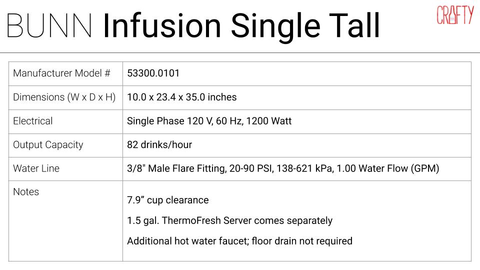 The BUNN Infusion Single Tall is a reliable choice for offices with high coffee consumption. Its single 1.5-gallon ThermoFresh Server keeps coffee hot and fresh while SmartWAVE technology ensures optimal extraction every time. Designed for efficiency and ease of use, this brewer is ideal for any workplace looking to upgrade their coffee game.