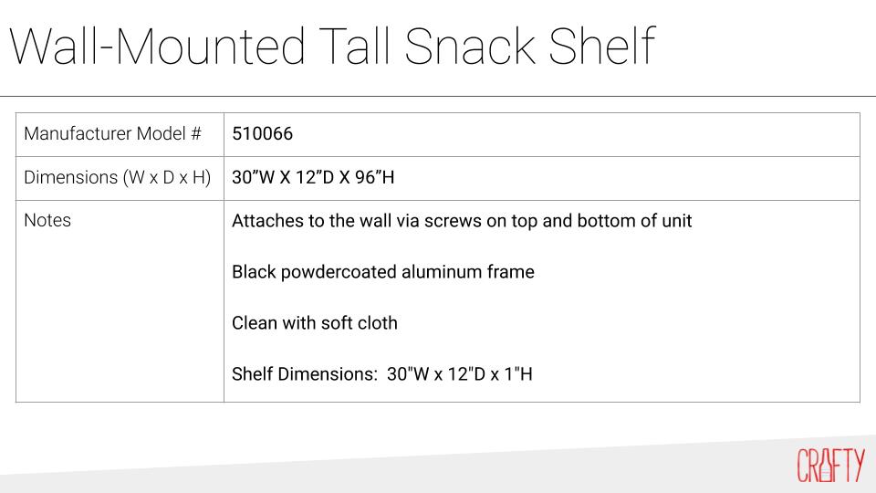 Elevate your office snack station—literally. This tall, wall-mounted snack shelf offers a modern, vertical display that brings your snacks to eye level while saving precious floor space. Its streamlined aluminum frame and minimalist design make it an ideal match for curated pantry aesthetics.